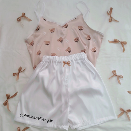 ست ساتن ۳ تکه شامل تاپ و شورتک و اسکرانچی مدل خرسی